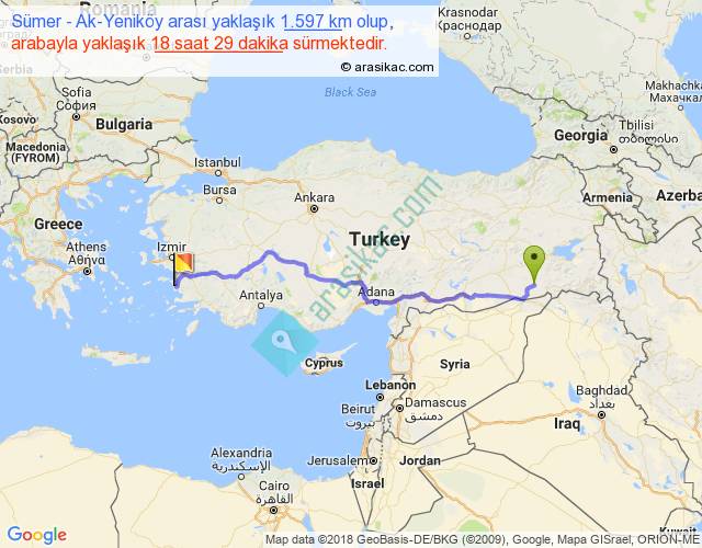 Sümer - Ak-Yeniköy arası yaklaşık olarak 90 km/h ile yukarıda belirtilen sürede olup, iki yerin kuş uçuşu uzaklığı (mesafesi) 1257'dir. Eğer belirtilen yerler arasında uçak seferi var ise bu süre uçakla 1 saat 56 dakika'ya kadar düşebilir. Yolculuk otobüsle 1 gün 0 saat sürmektedir.