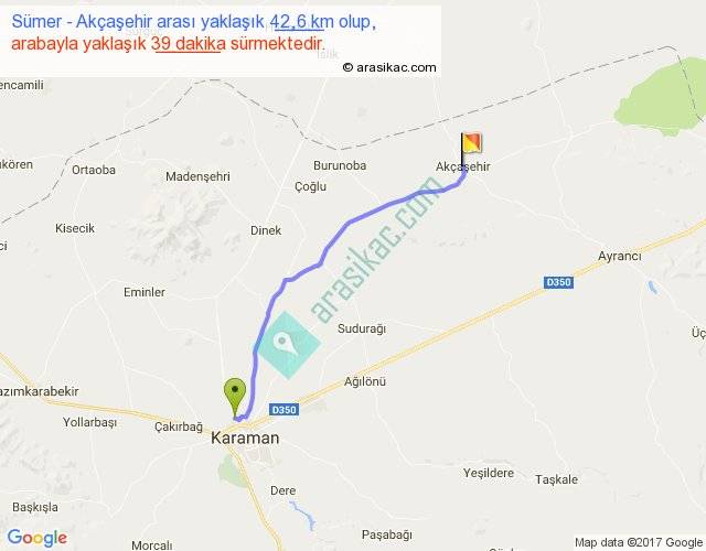 Sümer - Akçaşehir arası yaklaşık olarak 90 km/h ile yukarıda belirtilen sürede olup, iki yerin kuş uçuşu uzaklığı (mesafesi) 37'dir. Yolculuk otobüsle 50 dakika sürmektedir.