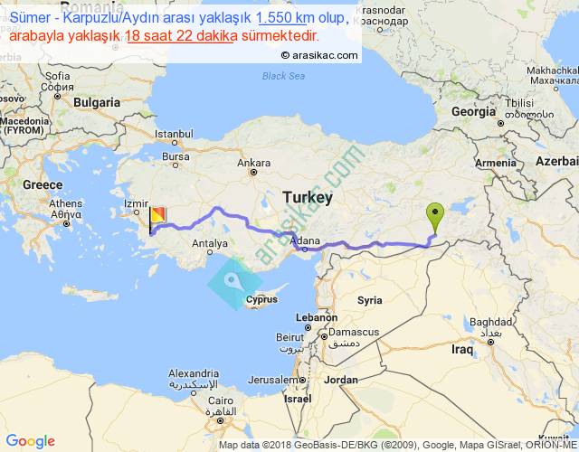 Sümer - Karpuzlu Aydın arası yaklaşık olarak 90 km/h ile yukarıda belirtilen sürede olup, iki yerin kuş uçuşu uzaklığı (mesafesi) 1208'dir. Eğer belirtilen yerler arasında uçak seferi var ise bu süre uçakla 1 saat 51 dakika'ya kadar düşebilir. Yolculuk otobüsle 23 saat 52 dakika sürmektedir.