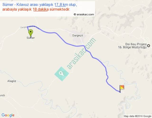 Sümer - Kılavuz arası yaklaşık olarak 90 km/h ile yukarıda belirtilen sürede olup, iki yerin kuş uçuşu uzaklığı (mesafesi) 13'dir. Yolculuk otobüsle 23 dakika sürmektedir.