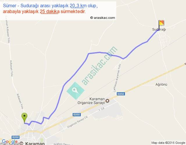 Sümer - Sudurağı arası yaklaşık olarak 90 km/h ile yukarıda belirtilen sürede olup, iki yerin kuş uçuşu uzaklığı (mesafesi) 17'dir. Yolculuk otobüsle 32 dakika sürmektedir.
