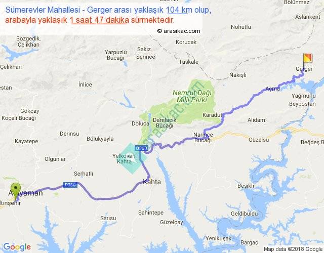 Sümerevler Mahallesi - Gerger arası yaklaşık olarak 90 km/h ile yukarıda belirtilen sürede olup, iki yerin kuş uçuşu uzaklığı (mesafesi) 75'dir. Yolculuk otobüsle 2 saat 19 dakika sürmektedir.
