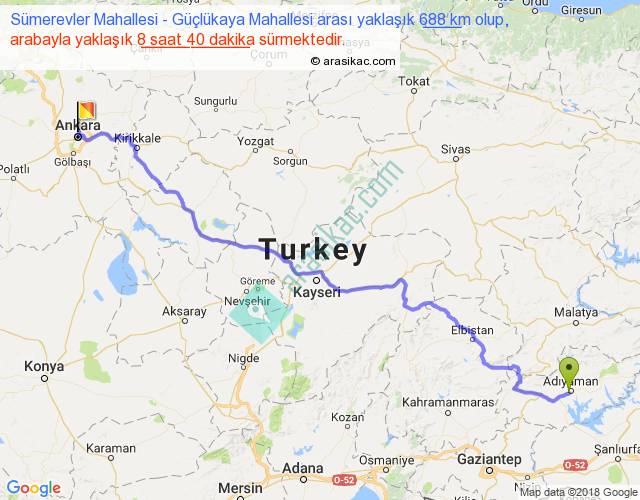 Sümerevler Mahallesi - Güçlükaya Mahallesi arası yaklaşık olarak 90 km/h ile yukarıda belirtilen sürede olup, iki yerin kuş uçuşu uzaklığı (mesafesi) 525'dir. Eğer belirtilen yerler arasında uçak seferi var ise bu süre uçakla 48 dakika'ya kadar düşebilir. Yolculuk otobüsle 11 saat 16 dakika sürmektedir.