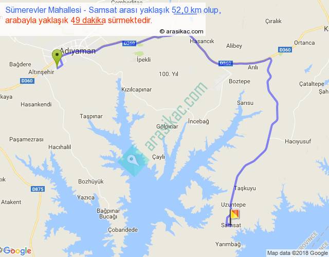 Sümerevler Mahallesi - Samsat arası yaklaşık olarak 90 km/h ile yukarıda belirtilen sürede olup, iki yerin kuş uçuşu uzaklığı (mesafesi) 27'dir. Yolculuk otobüsle 1 saat 3 dakika sürmektedir.