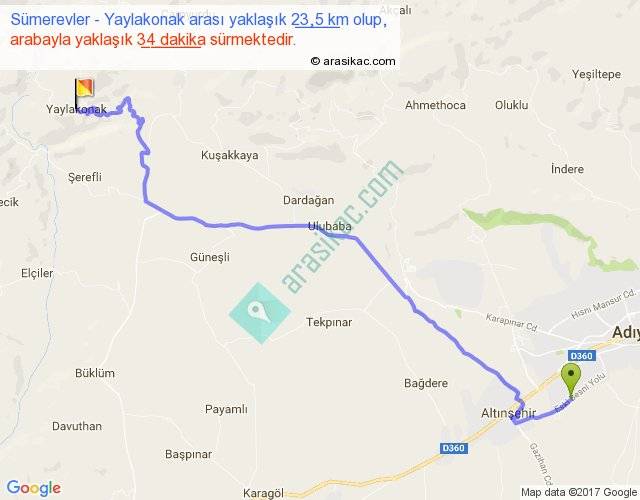 Sümerevler - Yaylakonak arası yaklaşık olarak 90 km/h ile yukarıda belirtilen sürede olup, iki yerin kuş uçuşu uzaklığı (mesafesi) 17'dir. Yolculuk otobüsle 44 dakika sürmektedir.