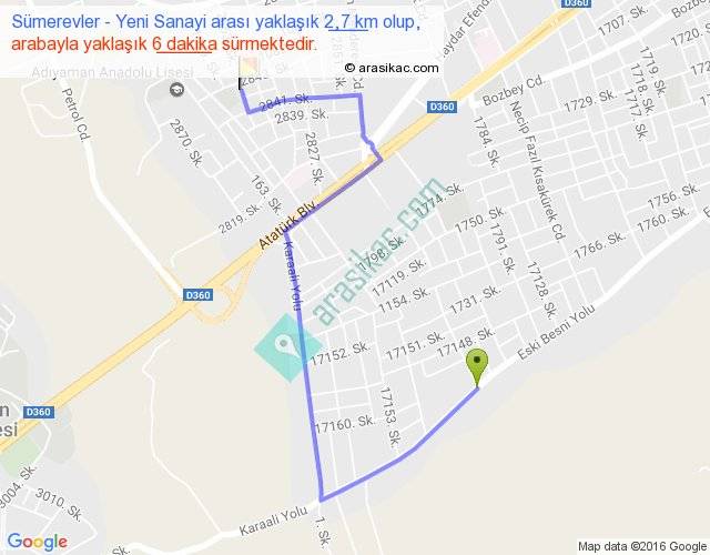 Sümerevler - Yeni Sanayi arası yaklaşık olarak 90 km/h ile yukarıda belirtilen sürede olup, iki yerin kuş uçuşu uzaklığı (mesafesi) 1'dir. Yolculuk otobüsle 7 dakika sürmektedir.