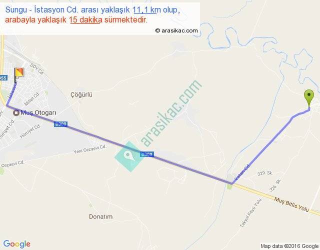 Sungu - İstasyon Cd. arası yaklaşık olarak 90 km/h ile yukarıda belirtilen sürede olup, iki yerin kuş uçuşu uzaklığı (mesafesi) 9'dir. Yolculuk otobüsle 19 dakika sürmektedir.