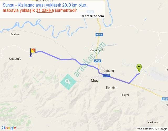 Sungu - Kizilagac arası yaklaşık olarak 90 km/h ile yukarıda belirtilen sürede olup, iki yerin kuş uçuşu uzaklığı (mesafesi) 25'dir. Yolculuk otobüsle 40 dakika sürmektedir.