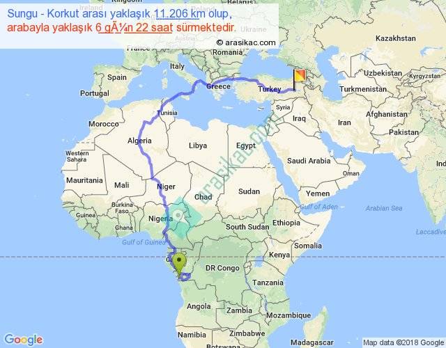 Sungu - Korkut arası yaklaşık olarak 90 km/h ile yukarıda belirtilen sürede olup, iki yerin kuş uçuşu uzaklığı (mesafesi) 5700'dir. Eğer belirtilen yerler arasında uçak seferi var ise bu süre uçakla 8 saat 46 dakika'ya kadar düşebilir. Yolculuk otobüsle 8 gün 23 saat sürmektedir.