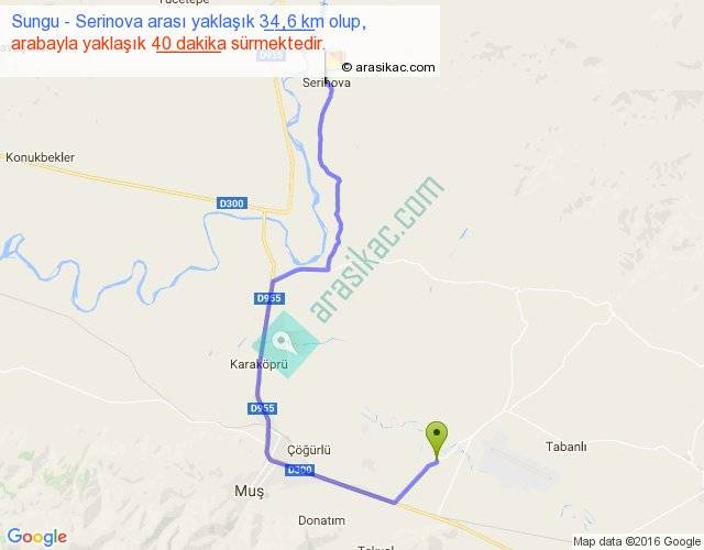 Sungu - Serinova arası yaklaşık olarak 90 km/h ile yukarıda belirtilen sürede olup, iki yerin kuş uçuşu uzaklığı (mesafesi) 21'dir. Yolculuk otobüsle 52 dakika sürmektedir.