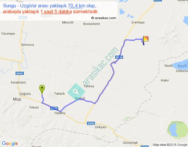 Sungu - Uzgörür arası yaklaşık olarak 90 km/h ile yukarıda belirtilen sürede olup, iki yerin kuş uçuşu uzaklığı (mesafesi) 46'dir. Yolculuk otobüsle 1 saat 24 dakika sürmektedir.