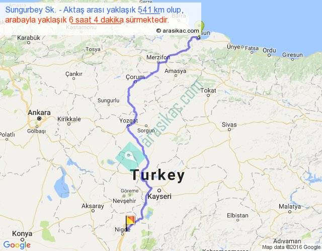 Sungurbey Sk. - Aktaş arası yaklaşık olarak 90 km/h ile yukarıda belirtilen sürede olup, iki yerin kuş uçuşu uzaklığı (mesafesi) 383'dir. Eğer belirtilen yerler arasında uçak seferi var ise bu süre uçakla 35 dakika'ya kadar düşebilir. Yolculuk otobüsle 7 saat 53 dakika sürmektedir.