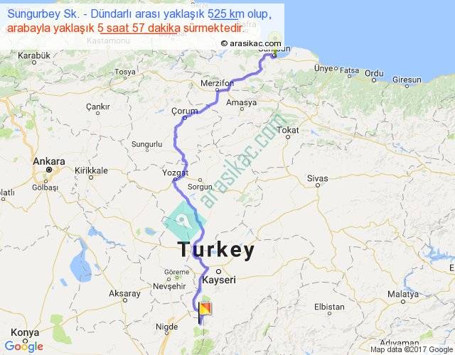 Sungurbey Sk. - Dündarlı arası yaklaşık olarak 90 km/h ile yukarıda belirtilen sürede olup, iki yerin kuş uçuşu uzaklığı (mesafesi) 365'dir. Eğer belirtilen yerler arasında uçak seferi var ise bu süre uçakla 33 dakika'ya kadar düşebilir. Yolculuk otobüsle 7 saat 44 dakika sürmektedir.