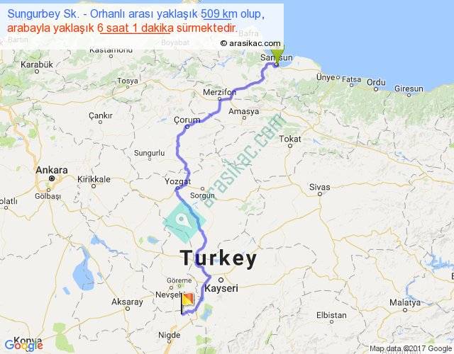Sungurbey Sk. - Orhanlı arası yaklaşık olarak 90 km/h ile yukarıda belirtilen sürede olup, iki yerin kuş uçuşu uzaklığı (mesafesi) 350'dir. Eğer belirtilen yerler arasında uçak seferi var ise bu süre uçakla 32 dakika'ya kadar düşebilir. Yolculuk otobüsle 7 saat 49 dakika sürmektedir.