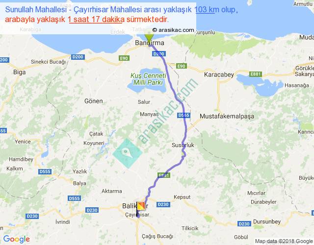 Sunullah Mahallesi - Çayırhisar Mahallesi arası yaklaşık olarak 90 km/h ile yukarıda belirtilen sürede olup, iki yerin kuş uçuşu uzaklığı (mesafesi) 81'dir. Yolculuk otobüsle 1 saat 40 dakika sürmektedir.