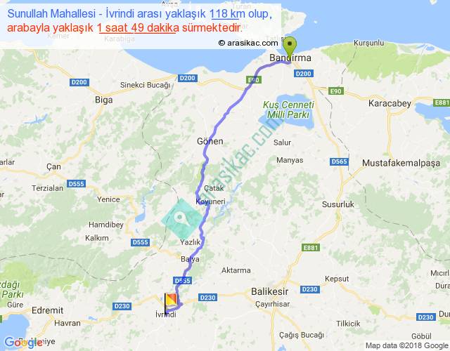 Sunullah Mahallesi - İvrindi arası yaklaşık olarak 90 km/h ile yukarıda belirtilen sürede olup, iki yerin kuş uçuşu uzaklığı (mesafesi) 93'dir. Yolculuk otobüsle 2 saat 21 dakika sürmektedir.