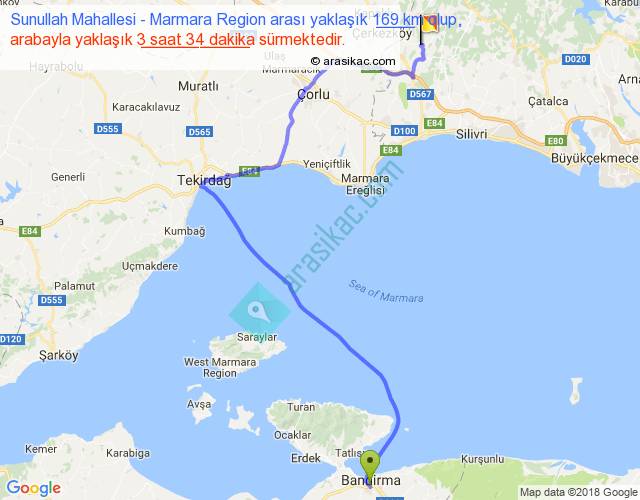 Sunullah Mahallesi - Marmara Region arası yaklaşık olarak 90 km/h ile yukarıda belirtilen sürede olup, iki yerin kuş uçuşu uzaklığı (mesafesi) 102'dir. Yolculuk otobüsle 4 saat 38 dakika sürmektedir.