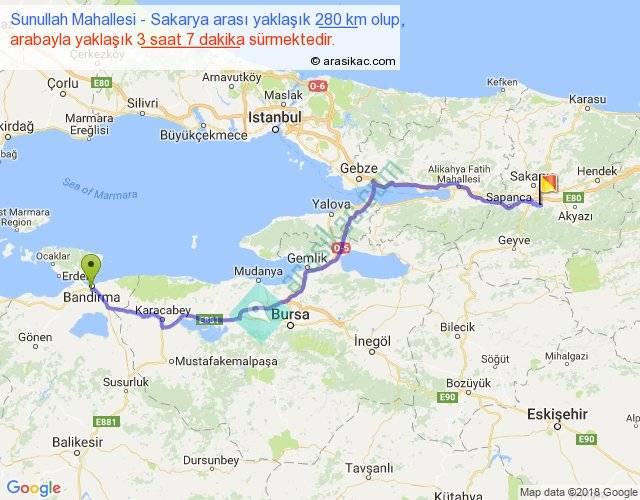 Sunullah Mahallesi - Sakarya arası yaklaşık olarak 90 km/h ile yukarıda belirtilen sürede olup, iki yerin kuş uçuşu uzaklığı (mesafesi) 211'dir. Yolculuk otobüsle 4 saat 3 dakika sürmektedir.