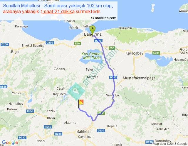 Sunullah Mahallesi - Samli arası yaklaşık olarak 90 km/h ile yukarıda belirtilen sürede olup, iki yerin kuş uçuşu uzaklığı (mesafesi) 59'dir. Yolculuk otobüsle 1 saat 45 dakika sürmektedir.