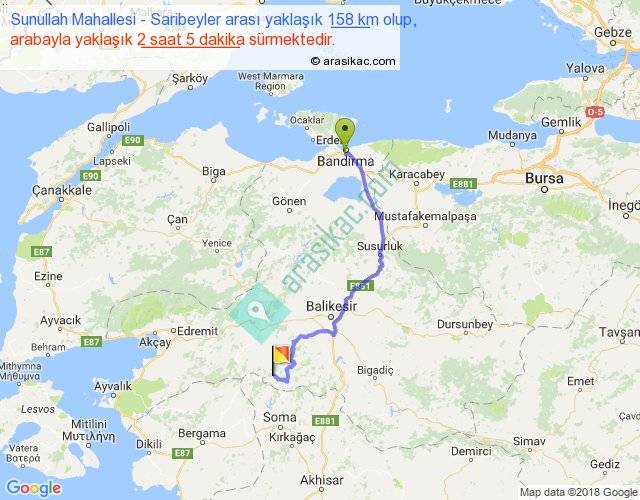 Sunullah Mahallesi - Saribeyler arası yaklaşık olarak 90 km/h ile yukarıda belirtilen sürede olup, iki yerin kuş uçuşu uzaklığı (mesafesi) 109'dir. Yolculuk otobüsle 2 saat 42 dakika sürmektedir.