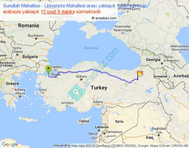 Sunullah Mahallesi - Üniversite Mahallesi arası yaklaşık olarak 90 km/h ile yukarıda belirtilen sürede olup, iki yerin kuş uçuşu uzaklığı (mesafesi) 1123'dir. Eğer belirtilen yerler arasında uçak seferi var ise bu süre uçakla 1 saat 43 dakika'ya kadar düşebilir. Yolculuk otobüsle 19 saat 37 dakika sürmektedir.
