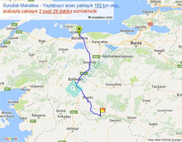 Sunullah Mahallesi - Yaylabayır arası yaklaşık olarak 90 km/h ile yukarıda belirtilen sürede olup, iki yerin kuş uçuşu uzaklığı (mesafesi) 136'dir. Yolculuk otobüsle 3 saat 12 dakika sürmektedir.