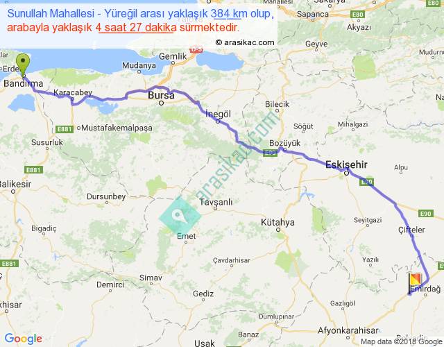 Sunullah Mahallesi - Yüreğil arası yaklaşık olarak 90 km/h ile yukarıda belirtilen sürede olup, iki yerin kuş uçuşu uzaklığı (mesafesi) 298'dir. Eğer belirtilen yerler arasında uçak seferi var ise bu süre uçakla 27 dakika'ya kadar düşebilir. Yolculuk otobüsle 5 saat 47 dakika sürmektedir.