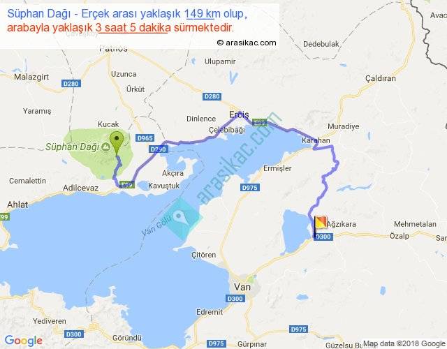 Süphan Dağı - Erçek arası yaklaşık olarak 90 km/h ile yukarıda belirtilen sürede olup, iki yerin kuş uçuşu uzaklığı (mesafesi) 73'dir. Yolculuk otobüsle 4 saat 0 dakika sürmektedir.
