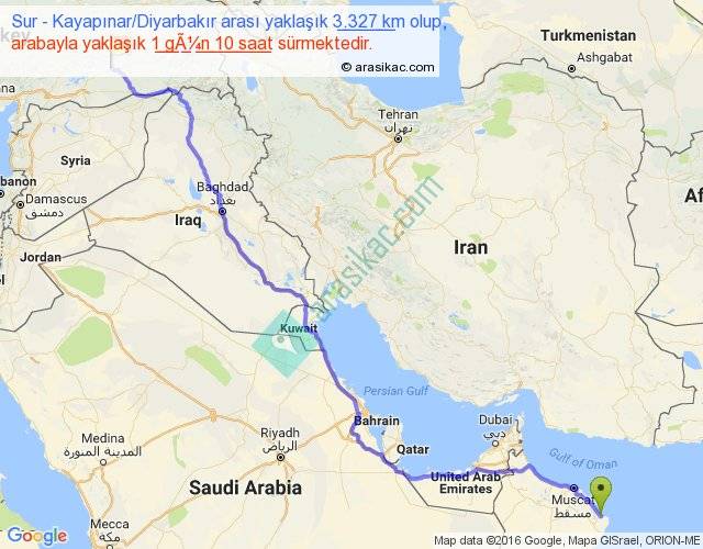 Sur - Kayapınar Diyarbakır arası yaklaşık olarak 90 km/h ile yukarıda belirtilen sürede olup, iki yerin kuş uçuşu uzaklığı (mesafesi) 2517'dir. Eğer belirtilen yerler arasında uçak seferi var ise bu süre uçakla 3 saat 52 dakika'ya kadar düşebilir. Yolculuk otobüsle 1 gün 20 saat sürmektedir.