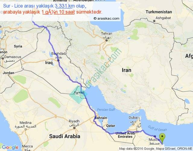 Sur - Lice arası yaklaşık olarak 90 km/h ile yukarıda belirtilen sürede olup, iki yerin kuş uçuşu uzaklığı (mesafesi) 2502'dir. Eğer belirtilen yerler arasında uçak seferi var ise bu süre uçakla 3 saat 50 dakika'ya kadar düşebilir. Yolculuk otobüsle 1 gün 20 saat sürmektedir.