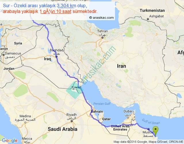 Sur - Özekli arası yaklaşık olarak 90 km/h ile yukarıda belirtilen sürede olup, iki yerin kuş uçuşu uzaklığı (mesafesi) 2504'dir. Eğer belirtilen yerler arasında uçak seferi var ise bu süre uçakla 3 saat 51 dakika'ya kadar düşebilir. Yolculuk otobüsle 1 gün 20 saat sürmektedir.