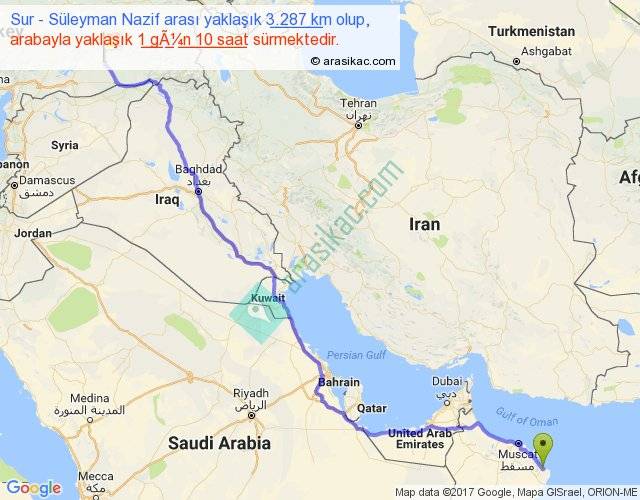 Sur - Süleyman Nazif arası yaklaşık olarak 90 km/h ile yukarıda belirtilen sürede olup, iki yerin kuş uçuşu uzaklığı (mesafesi) 2493'dir. Eğer belirtilen yerler arasında uçak seferi var ise bu süre uçakla 3 saat 50 dakika'ya kadar düşebilir. Yolculuk otobüsle 1 gün 20 saat sürmektedir.