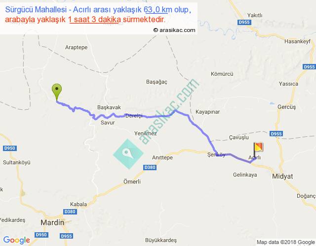 Sürgücü Mahallesi - Acırlı arası yaklaşık olarak 90 km/h ile yukarıda belirtilen sürede olup, iki yerin kuş uçuşu uzaklığı (mesafesi) 50'dir. Yolculuk otobüsle 1 saat 21 dakika sürmektedir.