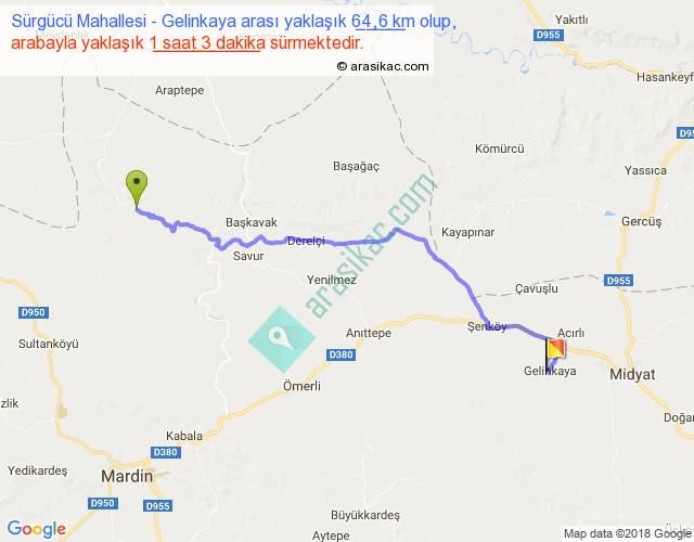 Sürgücü Mahallesi - Gelinkaya arası yaklaşık olarak 90 km/h ile yukarıda belirtilen sürede olup, iki yerin kuş uçuşu uzaklığı (mesafesi) 49'dir. Yolculuk otobüsle 1 saat 21 dakika sürmektedir.