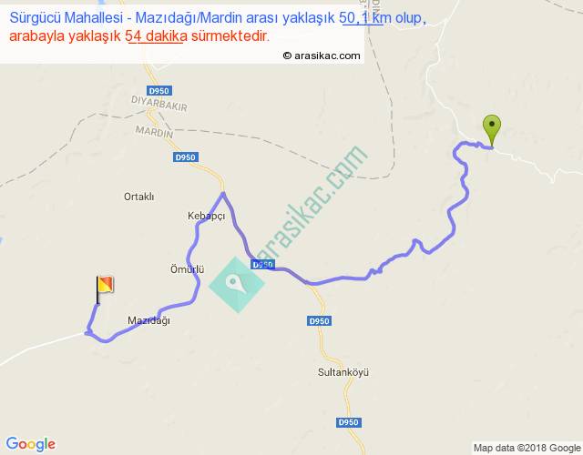 Sürgücü Mahallesi - Mazıdağı Mardin arası yaklaşık olarak 90 km/h ile yukarıda belirtilen sürede olup, iki yerin kuş uçuşu uzaklığı (mesafesi) 28'dir. Yolculuk otobüsle 1 saat 10 dakika sürmektedir.