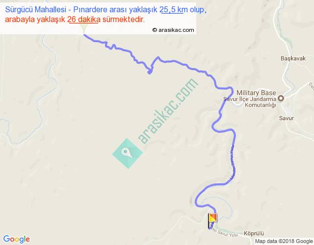 Sürgücü Mahallesi - Pınardere arası yaklaşık olarak 90 km/h ile yukarıda belirtilen sürede olup, iki yerin kuş uçuşu uzaklığı (mesafesi) 14'dir. Yolculuk otobüsle 33 dakika sürmektedir.