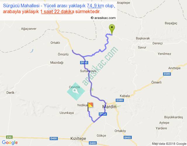 Sürgücü Mahallesi - Yüceli arası yaklaşık olarak 90 km/h ile yukarıda belirtilen sürede olup, iki yerin kuş uçuşu uzaklığı (mesafesi) 33'dir. Yolculuk otobüsle 1 saat 46 dakika sürmektedir.