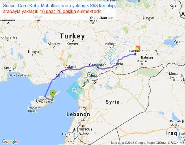 Suriçi - Cami Kebir Mahallesi arası yaklaşık olarak 90 km/h ile yukarıda belirtilen sürede olup, iki yerin kuş uçuşu uzaklığı (mesafesi) 638'dir. Eğer belirtilen yerler arasında uçak seferi var ise bu süre uçakla 58 dakika'ya kadar düşebilir. Yolculuk otobüsle 21 saat 21 dakika sürmektedir.
