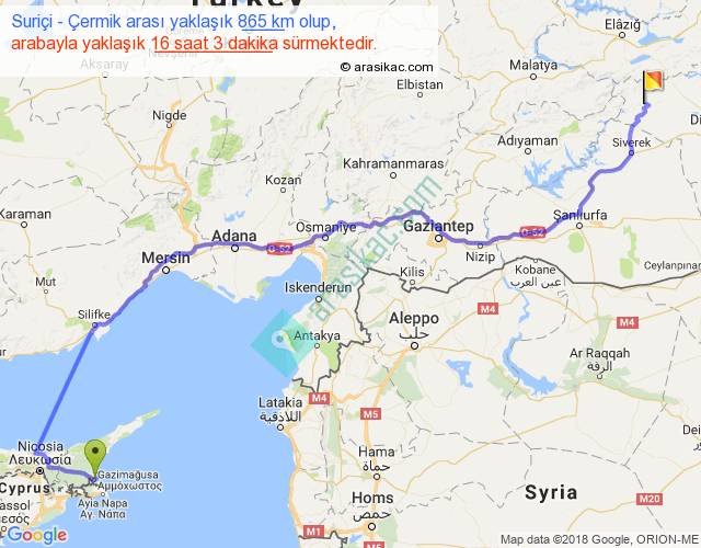 Suriçi - Çermik arası yaklaşık olarak 90 km/h ile yukarıda belirtilen sürede olup, iki yerin kuş uçuşu uzaklığı (mesafesi) 592'dir. Eğer belirtilen yerler arasında uçak seferi var ise bu süre uçakla 54 dakika'ya kadar düşebilir. Yolculuk otobüsle 20 saat 51 dakika sürmektedir.