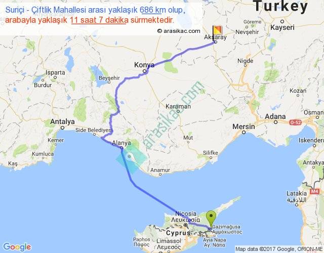 Suriçi - Çiftlik Mahallesi arası yaklaşık olarak 90 km/h ile yukarıda belirtilen sürede olup, iki yerin kuş uçuşu uzaklığı (mesafesi) 361'dir. Eğer belirtilen yerler arasında uçak seferi var ise bu süre uçakla 33 dakika'ya kadar düşebilir. Yolculuk otobüsle 14 saat 27 dakika sürmektedir.