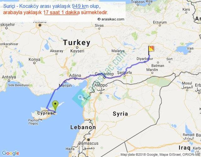 Suriçi - Kocaköy arası yaklaşık olarak 90 km/h ile yukarıda belirtilen sürede olup, iki yerin kuş uçuşu uzaklığı (mesafesi) 679'dir. Eğer belirtilen yerler arasında uçak seferi var ise bu süre uçakla 1 saat 02 dakika'ya kadar düşebilir. Yolculuk otobüsle 22 saat 7 dakika sürmektedir.