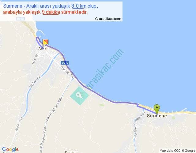 Sürmene - Araklı arası yaklaşık olarak 90 km/h ile yukarıda belirtilen sürede olup, iki yerin kuş uçuşu uzaklığı (mesafesi) 6'dir. Yolculuk otobüsle 11 dakika sürmektedir.
