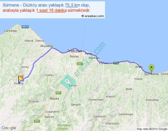 Sürmene - Düzköy arası yaklaşık olarak 90 km/h ile yukarıda belirtilen sürede olup, iki yerin kuş uçuşu uzaklığı (mesafesi) 58'dir. Yolculuk otobüsle 1 saat 38 dakika sürmektedir.