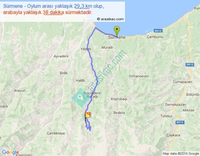 Sürmene - Oylum arası yaklaşık olarak 90 km/h ile yukarıda belirtilen sürede olup, iki yerin kuş uçuşu uzaklığı (mesafesi) 17'dir. Yolculuk otobüsle 49 dakika sürmektedir.