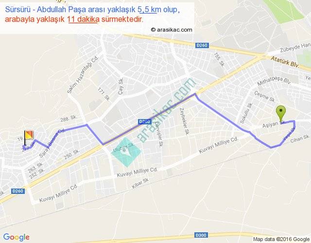 Sürsürü - Abdullah Paşa arası yaklaşık olarak 90 km/h ile yukarıda belirtilen sürede olup, iki yerin kuş uçuşu uzaklığı (mesafesi) 4'dir. Yolculuk otobüsle 14 dakika sürmektedir.