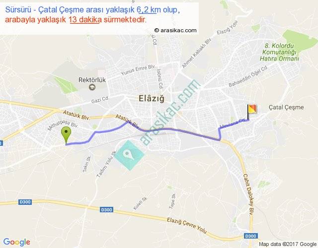 Sürsürü - Çatal Çeşme arası yaklaşık olarak 90 km/h ile yukarıda belirtilen sürede olup, iki yerin kuş uçuşu uzaklığı (mesafesi) 5'dir. Yolculuk otobüsle 16 dakika sürmektedir.
