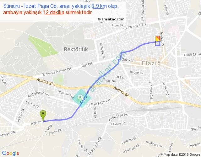Sürsürü - İzzet Paşa Cd. arası yaklaşık olarak 90 km/h ile yukarıda belirtilen sürede olup, iki yerin kuş uçuşu uzaklığı (mesafesi) 3'dir. Yolculuk otobüsle 15 dakika sürmektedir.