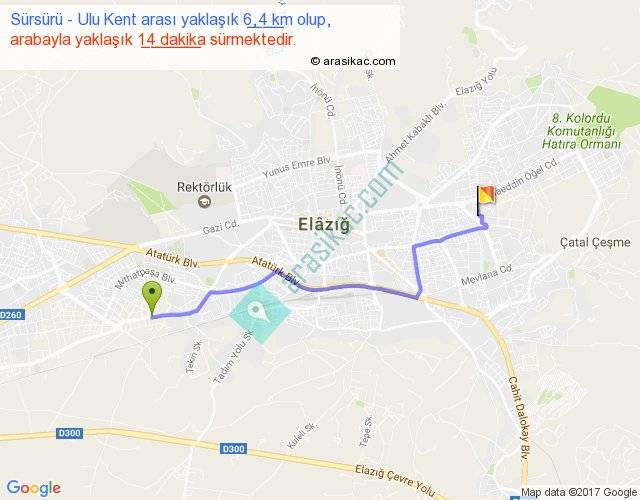 Sürsürü - Ulu Kent arası yaklaşık olarak 90 km/h ile yukarıda belirtilen sürede olup, iki yerin kuş uçuşu uzaklığı (mesafesi) 5'dir. Yolculuk otobüsle 18 dakika sürmektedir.