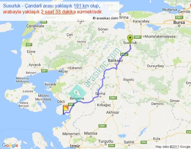 Susurluk - Çandarli arası yaklaşık olarak 90 km/h ile yukarıda belirtilen sürede olup, iki yerin kuş uçuşu uzaklığı (mesafesi) 151'dir. Yolculuk otobüsle 3 saat 18 dakika sürmektedir.