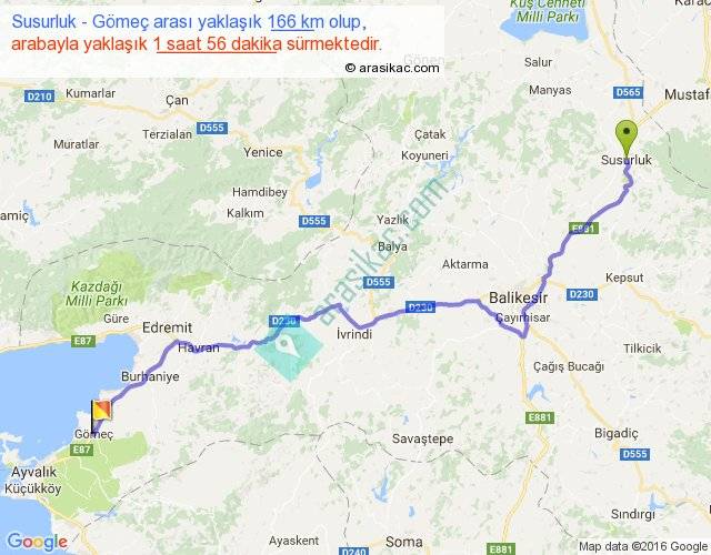 Susurluk - Gömeç arası yaklaşık olarak 90 km/h ile yukarıda belirtilen sürede olup, iki yerin kuş uçuşu uzaklığı (mesafesi) 126'dir. Yolculuk otobüsle 2 saat 30 dakika sürmektedir.
